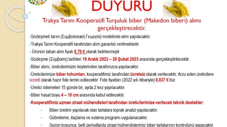Turşuluk biberin (Makedon Biberi) taban alım fiyatı 0,70 € olarak belirlenmiştir. Sözleşme (Σύμβαση) tarihleri 19 Aralık 2022 – 20 Şubat 2023 arasında gerçekleştirilecektir.