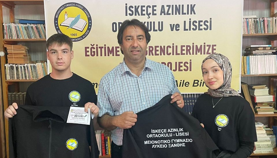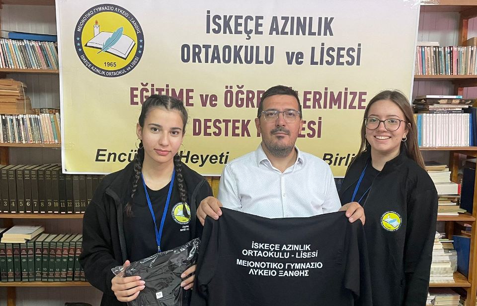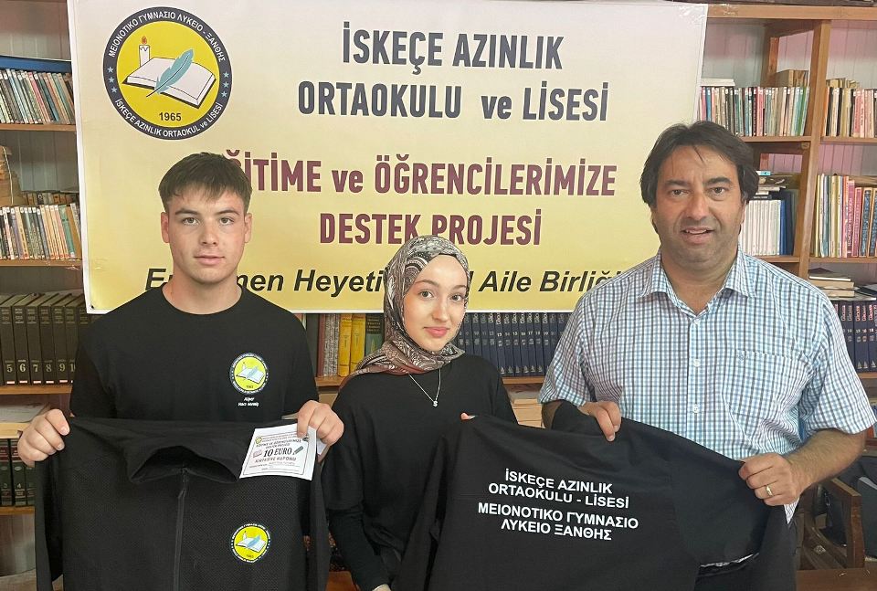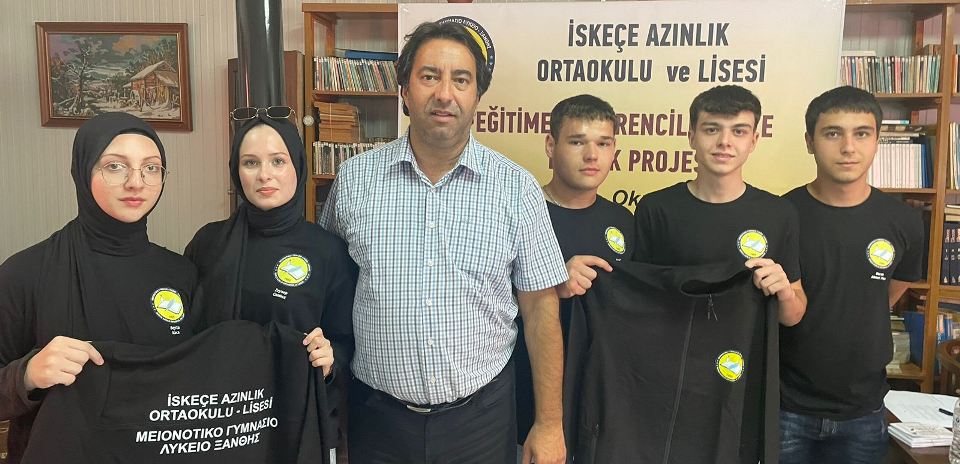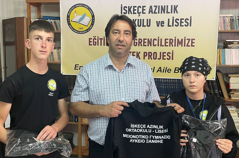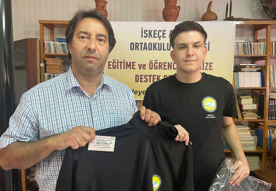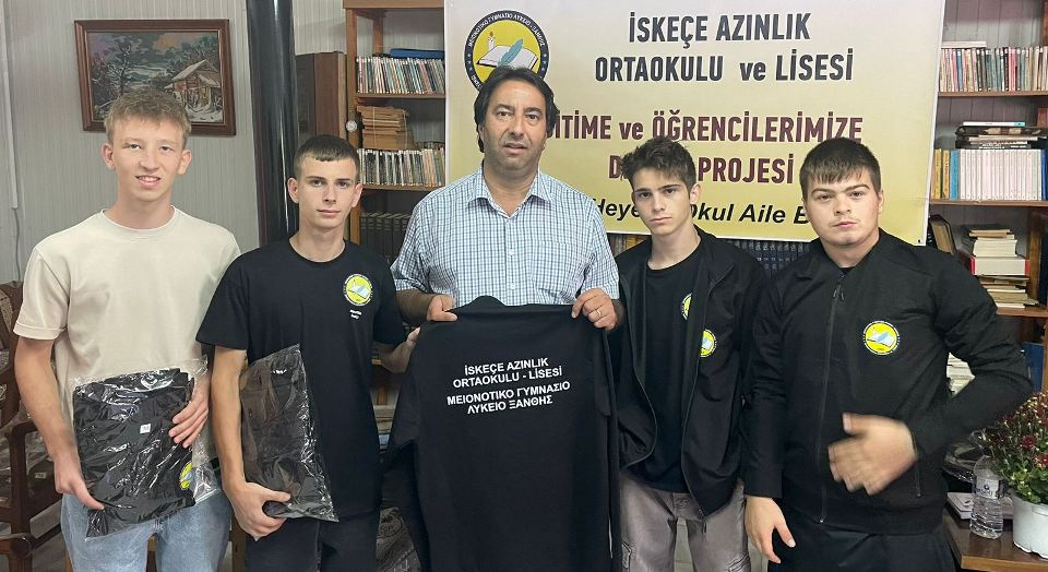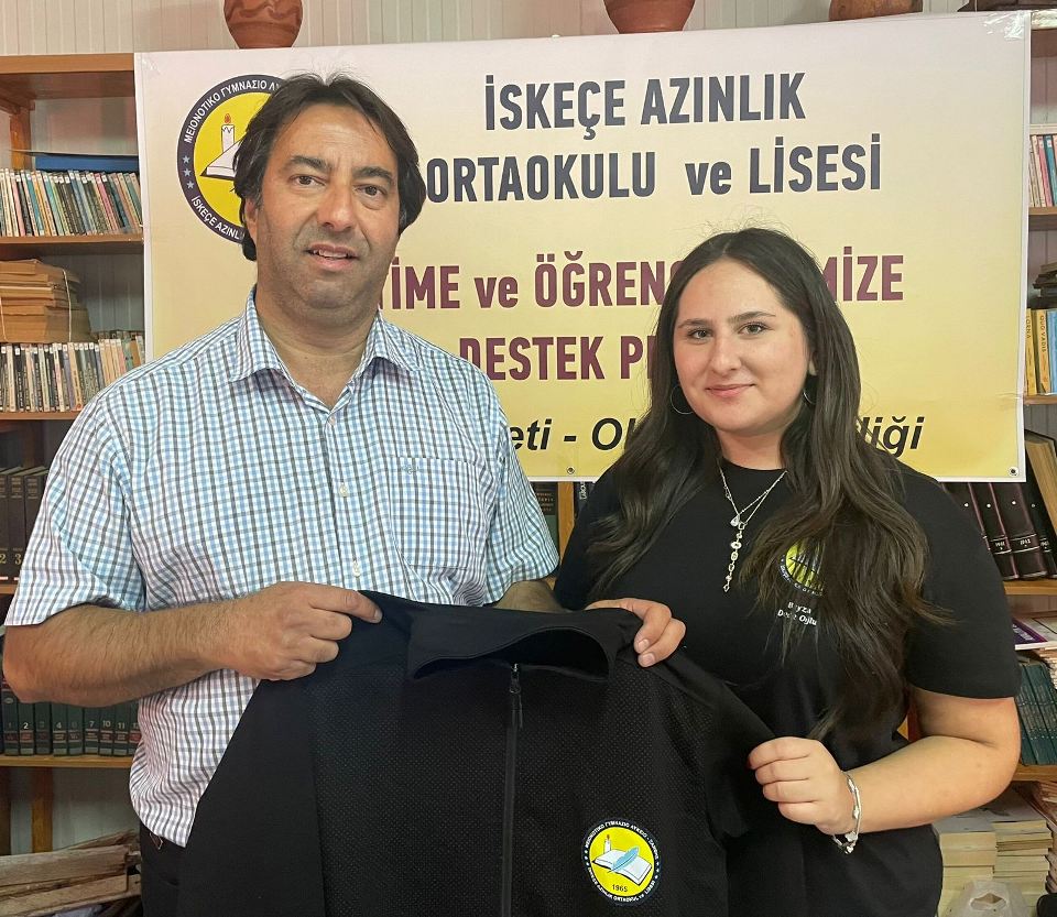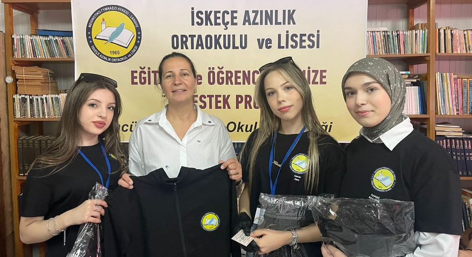 İlk etapta İskeçe Azınlık Ortaokulu – Lisesindeki tüm öğrencilere hediye edilecek Eşofman Takımı ve öğrenci başına 10 euroluk Kırtasiye Kuponu teslim edildi.
