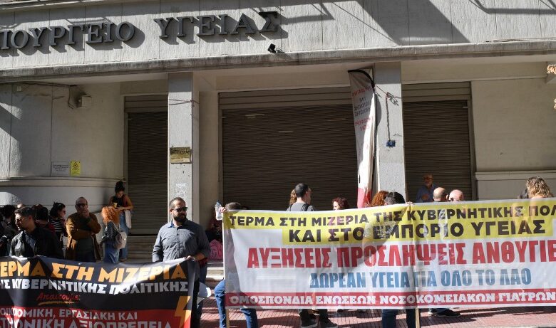 Yunanistan Hastane Doktorları Federasyonu (OENGE) tarafından organize edilen gösteride doktorlar kalıcı kadro istihdamı, maaş artışı ve kamu sağlık sisteminin güçlendirilmesi taleplerini yineledi.