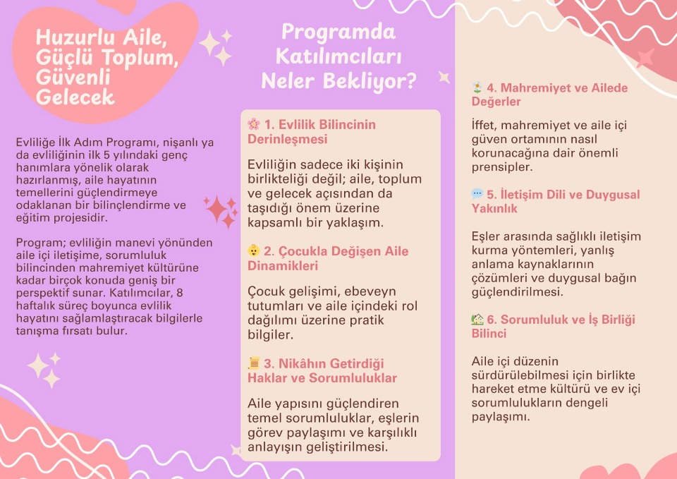 Program, evliliğin ilk beş yılı içindeki kadınlarla nişanlı genç kızlara yönelik kapsamlı bir eğitim ve destek çalışması olarak tasarlandı. Amaç; evliliğin manevi yönlerini güçlendirmek, sağlıklı iletişim becerilerini geliştirmek ve bilinçli aile yapısını desteklemek.