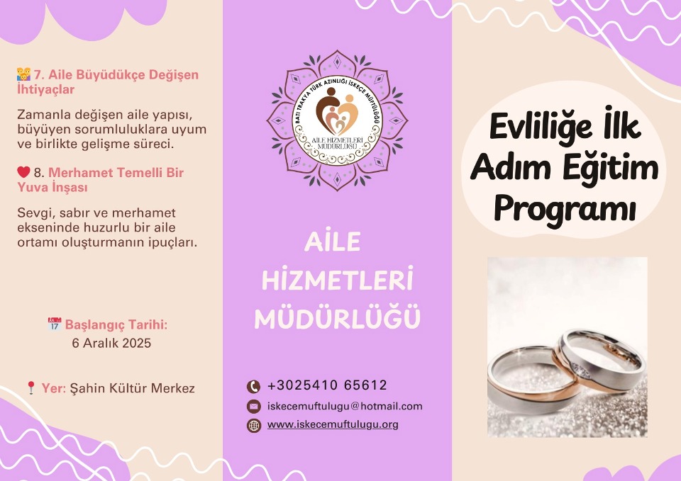 İskeçe Müftülüğü, Batı Trakya Türk Azınlığı Danışma Kurulu Başkanı ve İskeçe Müftüsü Mustafa Trampa’nın öncülüğünde aile kurumunu güçlendirmeye yönelik yeni bir projeyi hayata geçiriyor. “Evliliğe İlk Adım Eğitim Programı”, Müftülüğün Aile Hizmetleri Müdürlüğü tarafından hazırlanarak kamuoyuna duyuruldu.
