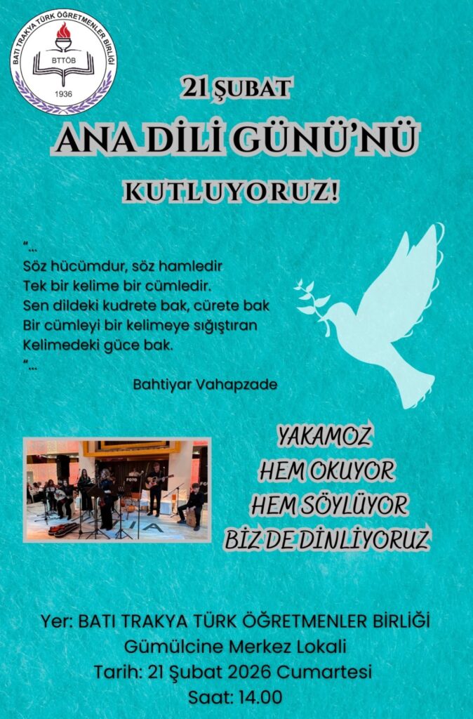 Batı Trakya Türk Öğretmenler Birliği, (BTTÖB) 21 Şubat Ana Dili Günü dolayısıyla düzenlediği etkinlikle ana dilin önemine dikkat çekmeye hazırlanıyor. 21 Şubat Cumartesi günü gerçekleştirilecek program, Gümülcine’deki Batı Trakya Türk Öğretmenler Birliği lokalinde saat 14.00’te başlayacak.