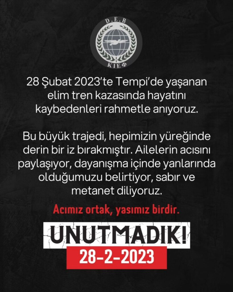 “28 Şubat 2023’te Tempi’de yaşanan elim tren kazasında hayatını kaybedenleri rahmetle anıyoruz. Bu büyük trajedi, hepimizin yüreğinde derin bir iz bırakmıştır. Ailelerin acısını paylaşıyor, dayanışma içinde yanlarında olduğumuzu belirtiyor, sabır ve metanet diliyoruz. Acımız ortak, yasımız birdir. UNUTMADIK! 28-2-2023.”